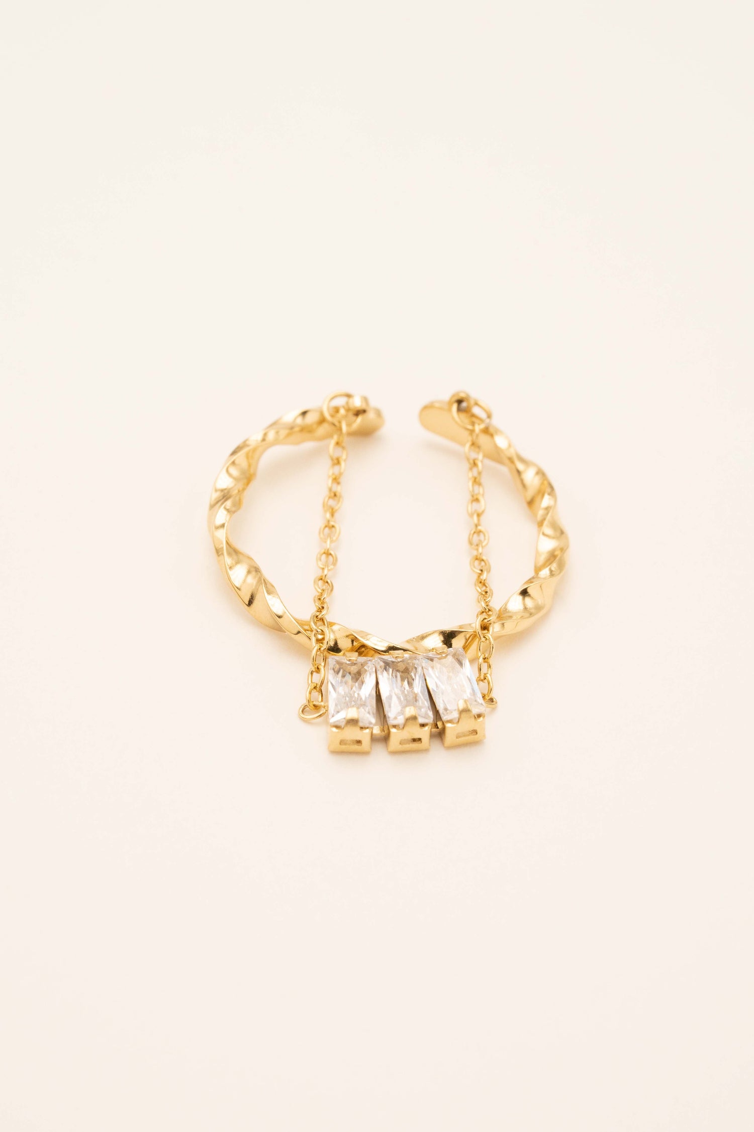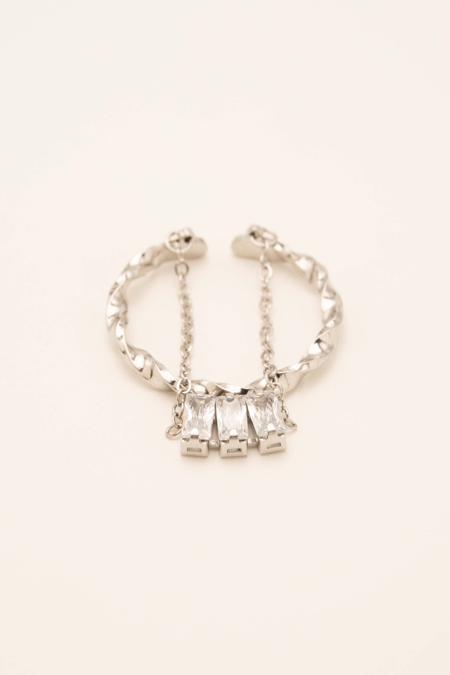 Stainless steel ring composed of a twisted ring and 3 zirconium oxides hung on a hanging chain.